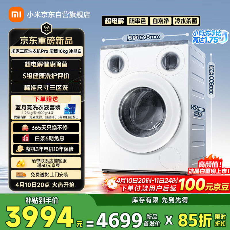 IT之家 4 月 10 日消息,小米旗下“米家三区洗衣机 Pro 滚筒 10kg 冰晶白”现已在京东发售,新品首发价 4699 元,国补价 3994 元。