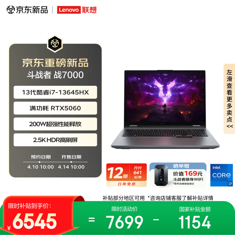 IT之家 4 月 10 日消息,联想现已在京东上架 2026 款来酷斗战者“战 7000 ”笔记本,该机采用 i7-13645HX 处理器,匹配 16GB RAM 和 512GB 存储空间,搭载 RTX5060 显卡,定价为 7699 元,部分地区国补后定价低至 6545 元。