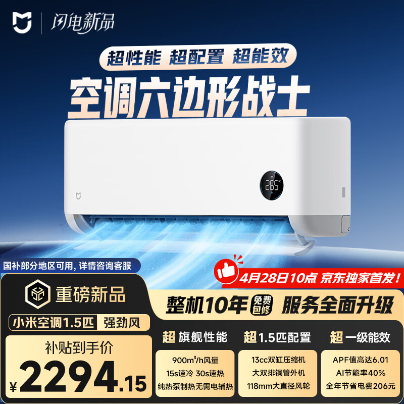 IT之家 4 月 12 日消息,小米新上架了一款米家空调强劲风超 1.5 匹,号称“空调六边形战士”,京东显示为 2699 元,叠加国补后 2294.15 元,4 月 28 日开售。