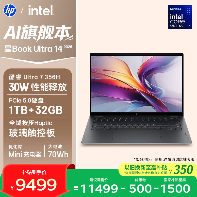 京东惠普 HP 星 Book Ultra 14 笔记本电脑酷睿 Ultra7 356H 32G 1T 2.8K OLED 触屏 灰券后 10998 元领 500 元券2026 年数码家电政府补贴持续进行中,IT 之家为大家汇总国补领券地址,买数码家电之前记得领取:点此查看。